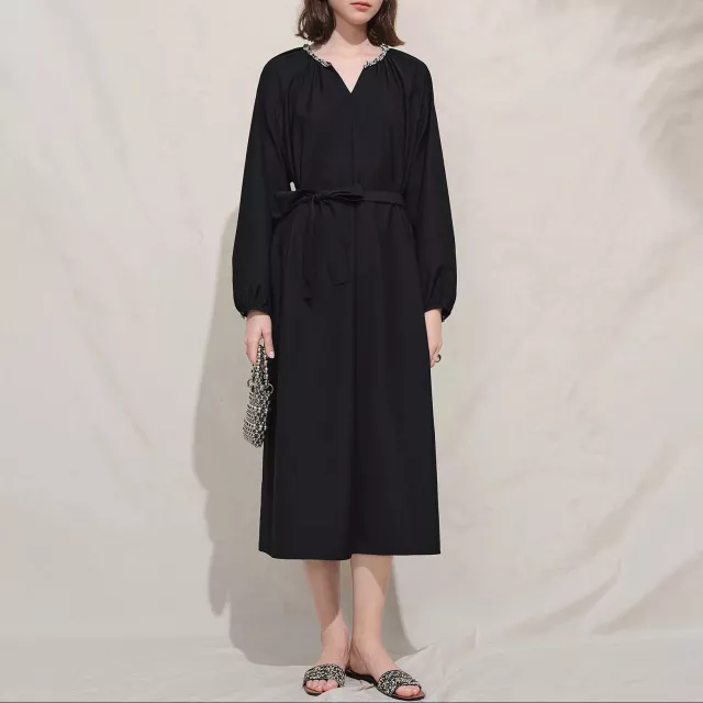 This dress is made from a high-quality cotton and polyester blend, giving it a soft feel with slight stretch for easy movement. The V-neckline adds a graceful touch, while the long regular sleeves keep you warm during cooler seasons. A lace-up waist tie beautifully defines your shape, making it suitable for different body types. The above-the-knee length keeps the look modern and youthful without being too bold.