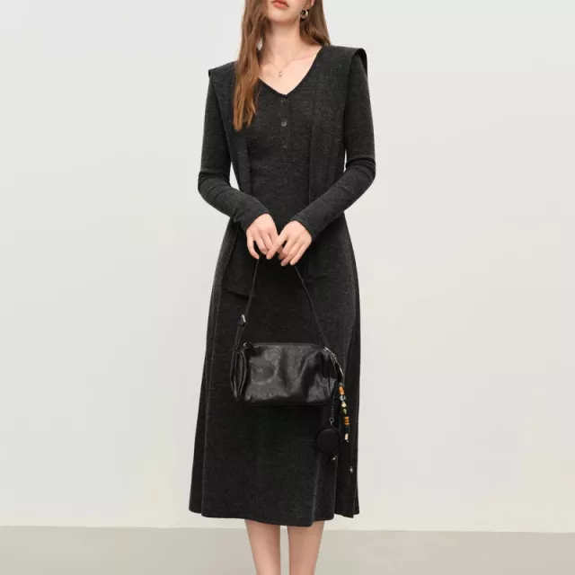 This chic black faux two-piece dress is designed to make you look polished without extra effort. The layered look gives the illusion of a styled outfit while keeping the comfort of a single dress. With its clean round neckline, long sleeves, and flattering A-line shape, it creates a soft, feminine silhouette that works for everyday wear or special occasions.