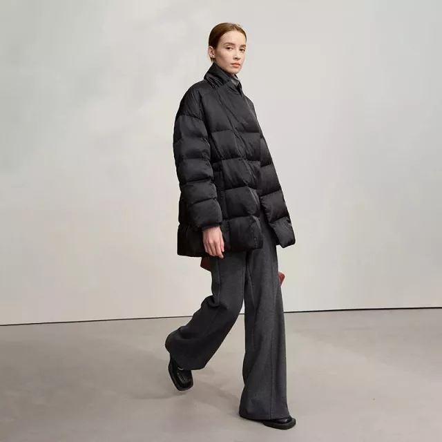 Step into Winter with a coat that blends cozy warmth and polished style. This long down jacket is designed to keep you comfortable on icy mornings while giving your outfit a sharp, elevated look. The turned knit collar adds a soft contrast against the smooth exterior, while the structured shoulder design gives you a confident, tailored shape without feeling stiff or bulky.